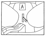 4. The stick of the cylinder is inserted through the slit of the strap (B), and then the strap is secured to the top of the brief at the patient’s waist at (A). This minimizes any mobilization of the cylinder.